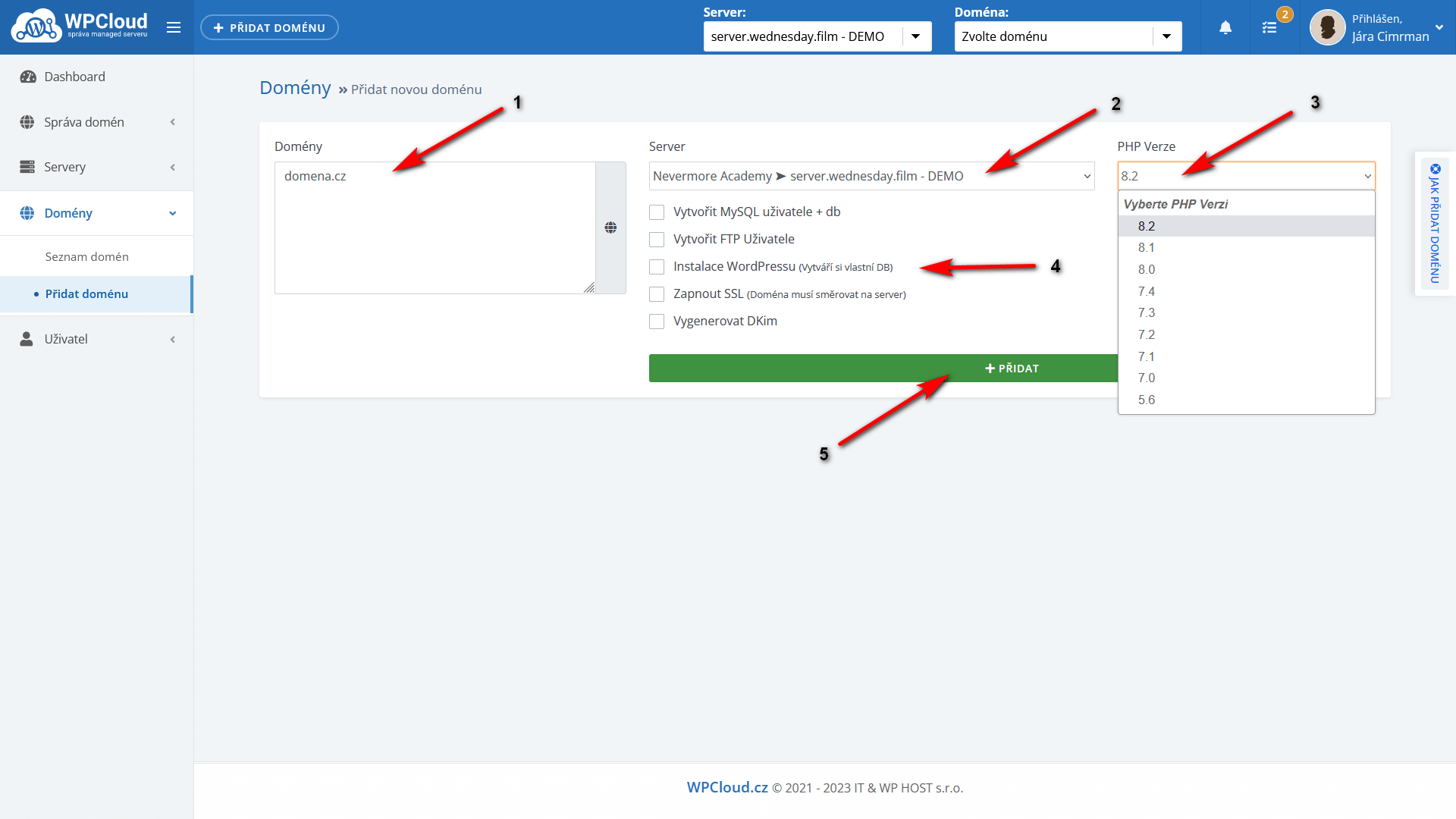 3) Vyberte PHP verzi (podporované jsou 5.6 – 8.2)